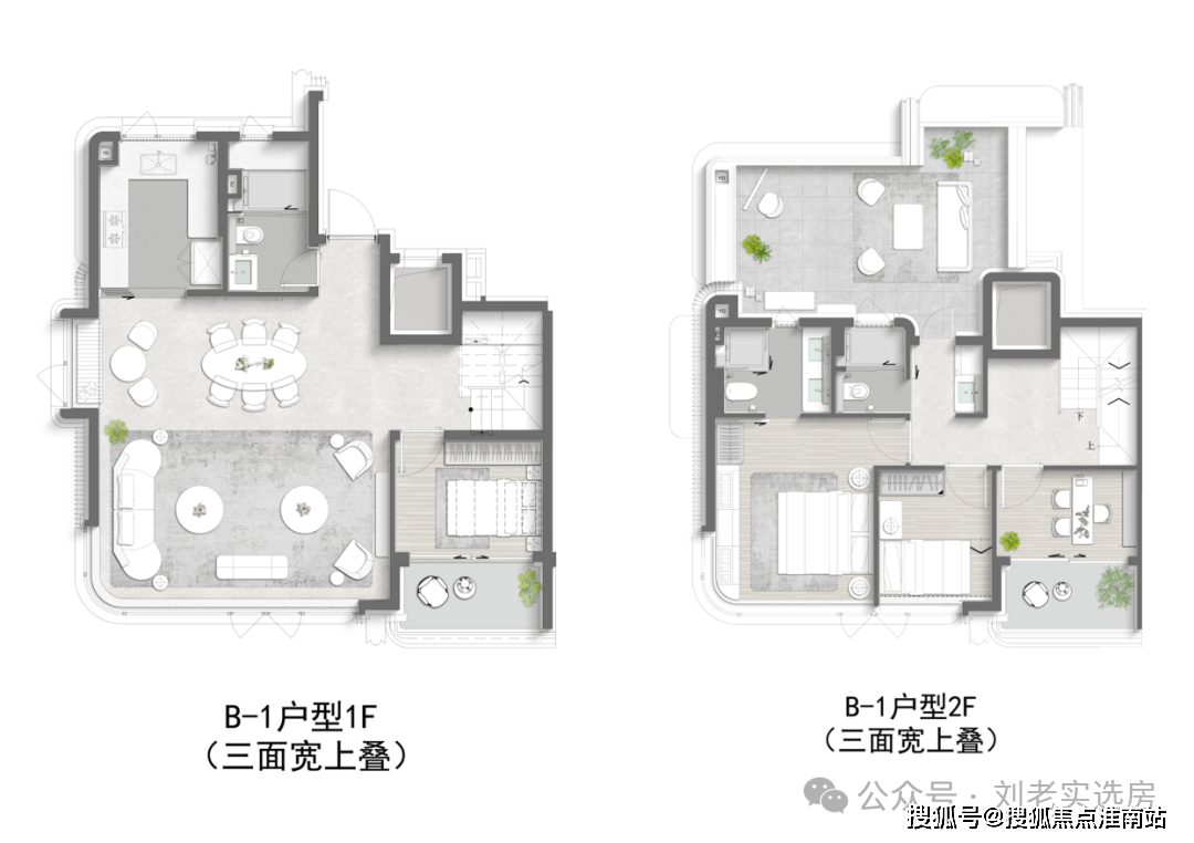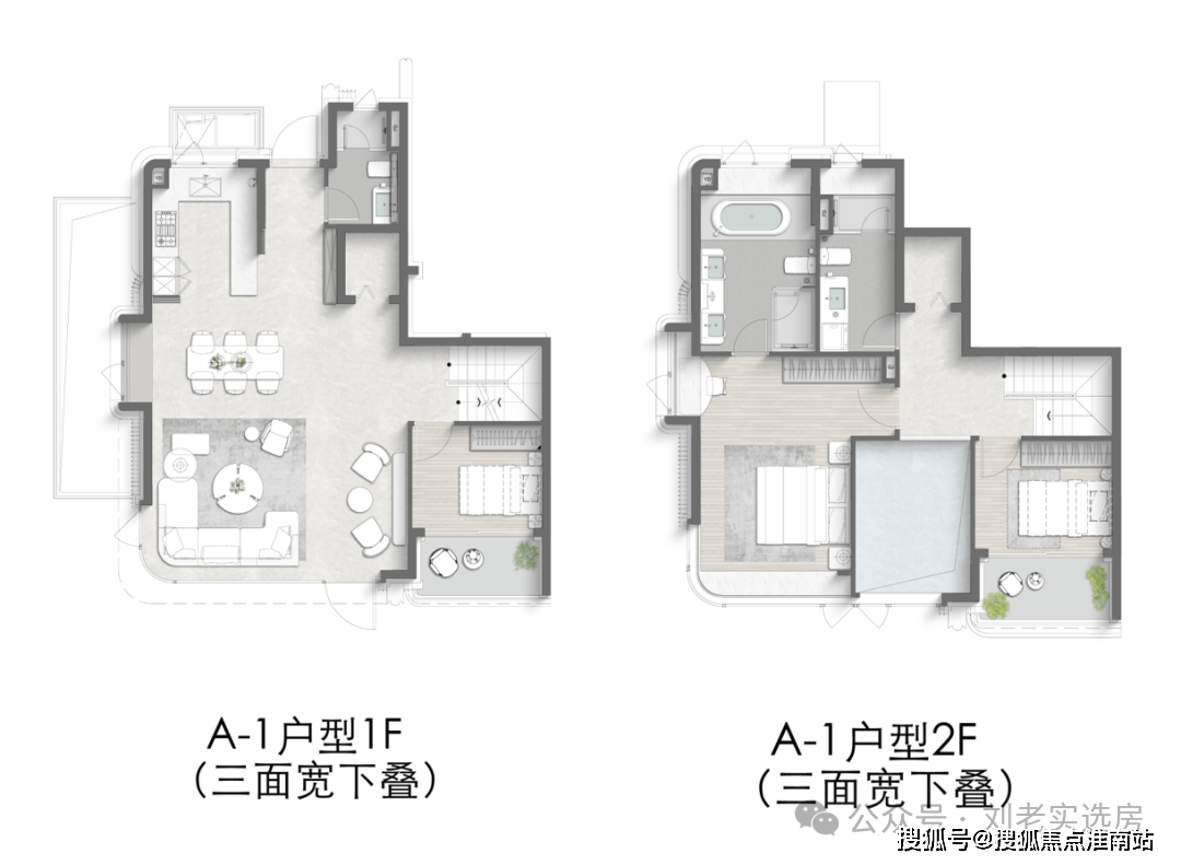 再来说项目标叠墅产物:约9.5米南向三面宽、独门独户、约6.1米地下室挑高(下叠)、超大天台(上叠)。