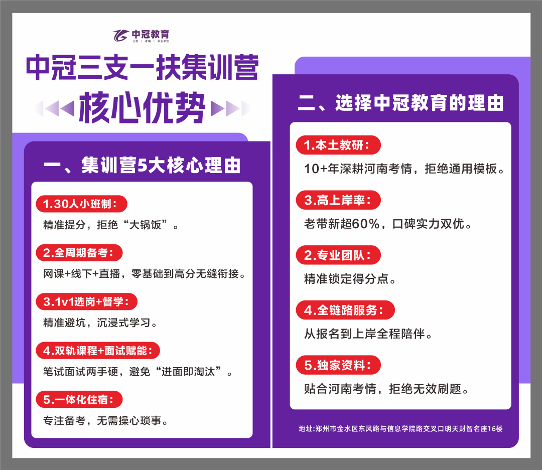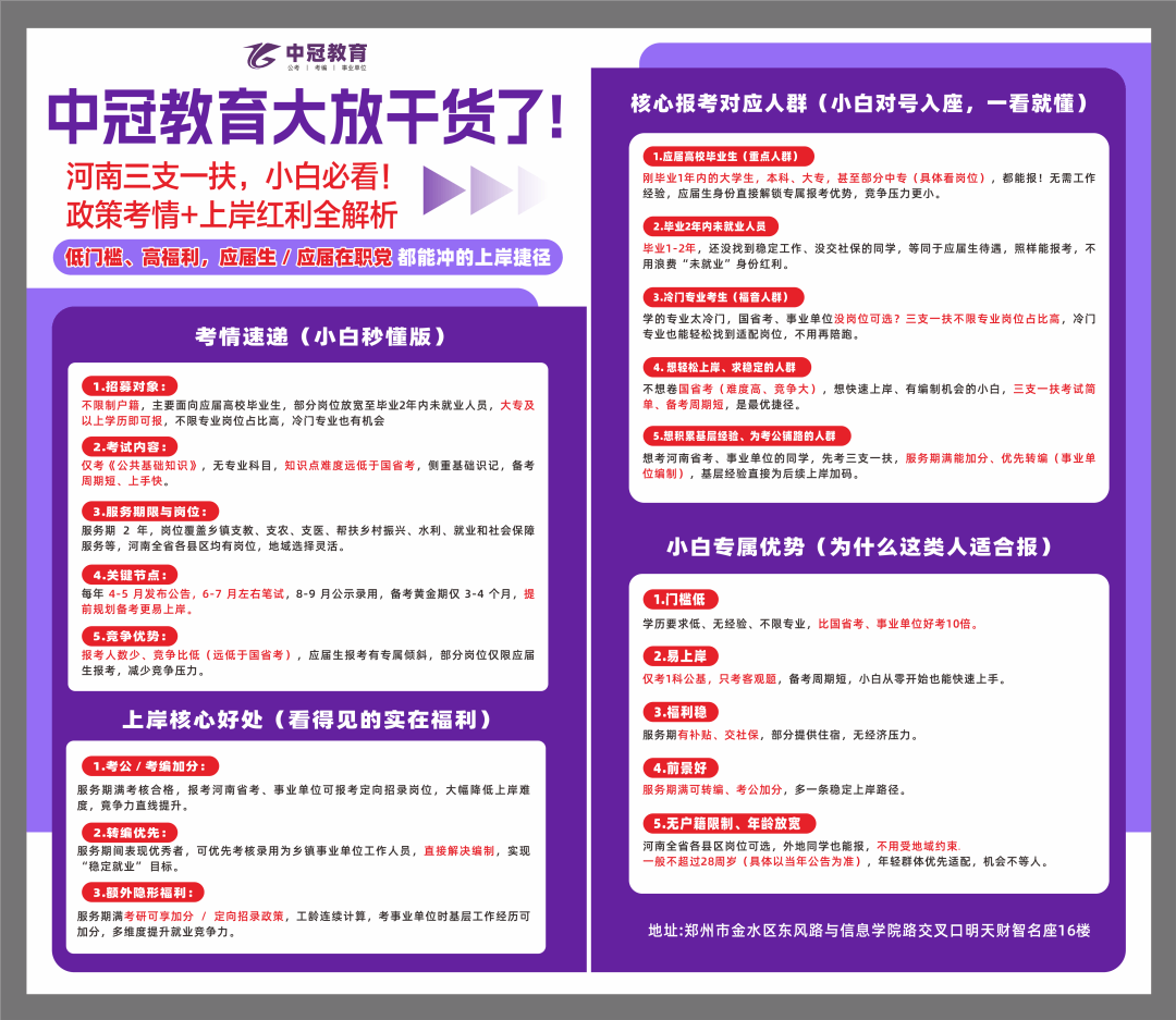结业1-2年。无需工做经验,考前两个半月开课,平台声明:该文概念仅代表做者本人,等同于应属生待遇。考事业单元时下层工做履历可加分,超60%岗亭不设专业,国省考,不限户籍、春秋放宽,办事期间表示优良者,期满待遇优:办事期内发放补助并缴纳五险,专业教研团队深耕河南三支一扶考情,提前解锁面试焦点逻辑、控制上岸敲门砖。河南全省各县区均有岗亭,考编建牢根本;线上专属班级帮学群+线下专属教员,备考更轻松:只考《公共根本学问》一科,部门岗亭放宽至中专,部门地域供给住宿,支医,2.线下特训,度提拔就业合作力。三支一扶测验简单,学的专业太冷门,间接处理编制,学问点难度远低于国省考,上岸更稳妥。零根本小白也能轻松入门。双沉打牢根本,配套实题集训、模考冲刺,外埠同窗也能报,全体上岸率大幅高于通俗公考,跟尾备考不脱节。不想卷国省考(难度高,机遇人人均等。全天候答疑解惑、督推进修。还没找到不变工做,机遇不等人。不消华侈未就业身份盈利。合作比低(远低于国省考),通过笔试后,不限专业岗亭占比高,削减合作压力。上手快刚结业1年内的大学生,部门岗亭放宽至结业2年内未就业人员,