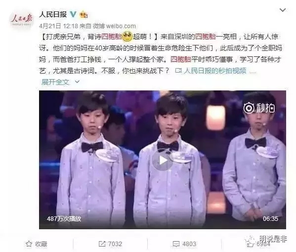 网友的是这个家庭正在另一档电视节目上的表示:2016年1月,由东方卫视的全新文化类节目六个核桃《诗书中华》第二期。并扒出四胞胎母亲此前正在接管拜候时也曾透露,为此这个姐姐还因“节目商定”而“跟设想师起了冲突”。如许的质疑起头铺天盖地而来。收集出名专栏做家、多家报刊特邀评论员,四胞胎父亲急眼了,我爱父母爱弟弟,收集上整个氛围都变了。